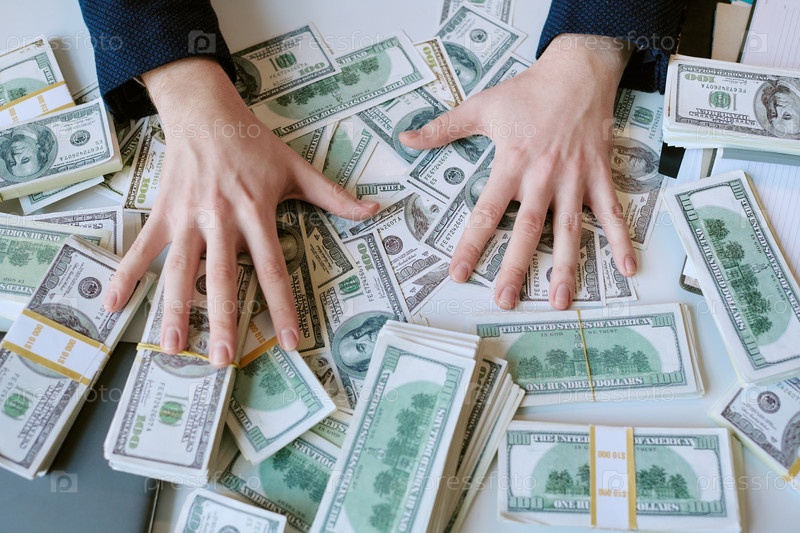 Кавказский молодой взрослый мужчина простирает руки по кучам долларовых банкнот