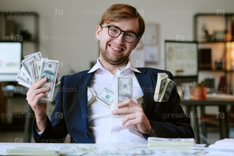 Портрет молодого взрослого белого мужчины, улыбающегося в то время как он держит долларовые банкноты