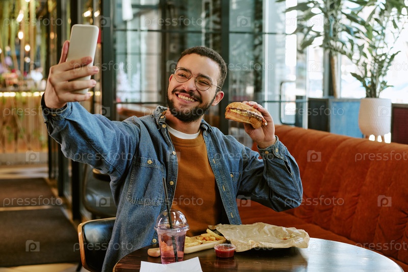 Молодой взрослый мужчина делает селфи, едя бургер в ресторане