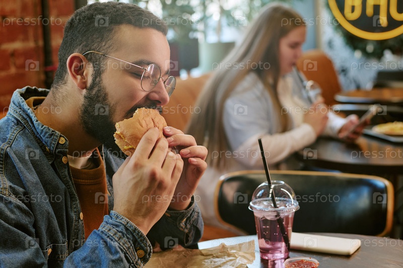 Молодой взрослый мужчина ест бургер, сидя в кафе-ресторане