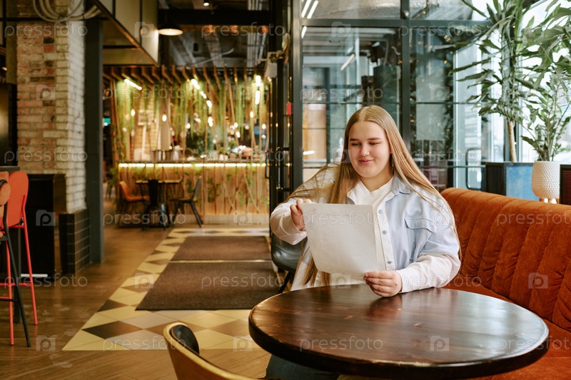 Молодая девушка улыбается, читая меню сидя в современном кафе