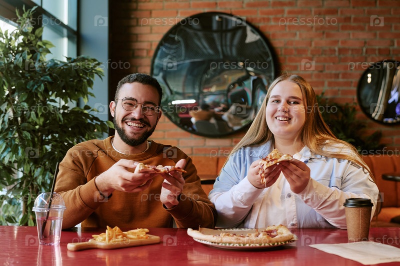 Молодая женщина и мужчина с Ближнего Востока наслаждаются пиццей вместе в помещении