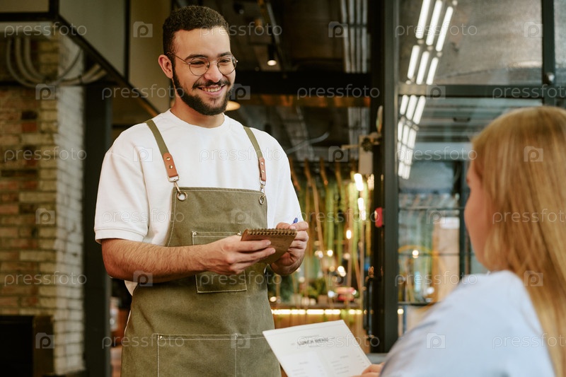 Молодой взрослый мужчина улыбается, принимая заказ от покупательницы