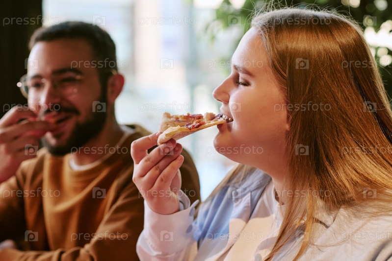 Молодая женщина наслаждается едой пиццы с молодым мужчиной в помещении