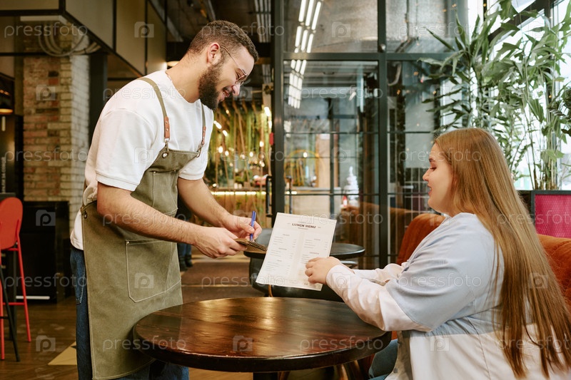 Молодая женщина заказывает еду у молодого человека в кафе