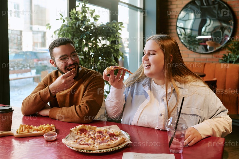 Молодая женщина и молодой мужчина наслаждаются пиццей вместе за столом в ресторане