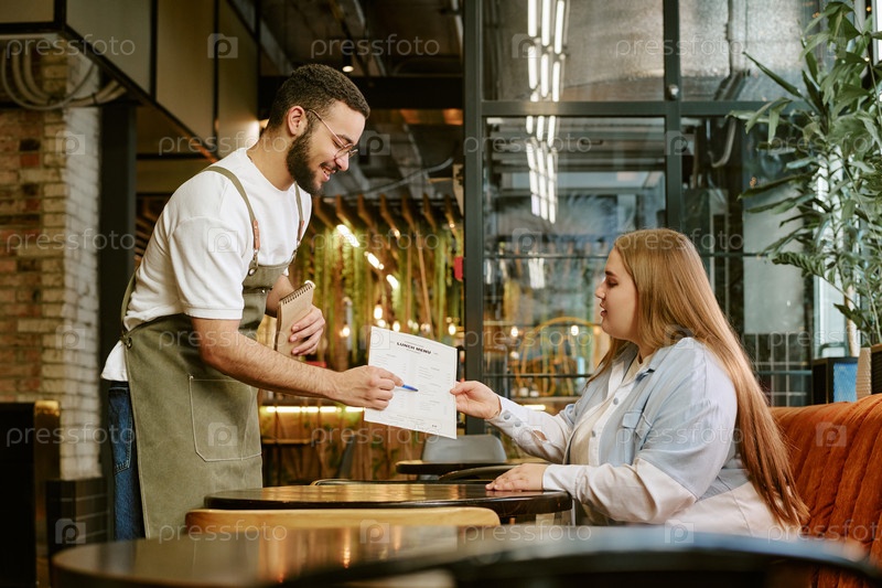 Молодая женщина получает счет от молодого ближневосточного официанта Indoors
