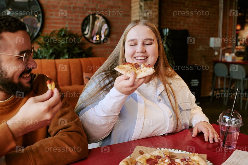 Молодая женщина улыбается, когда ест пиццу с молодым мужчиной в помещении