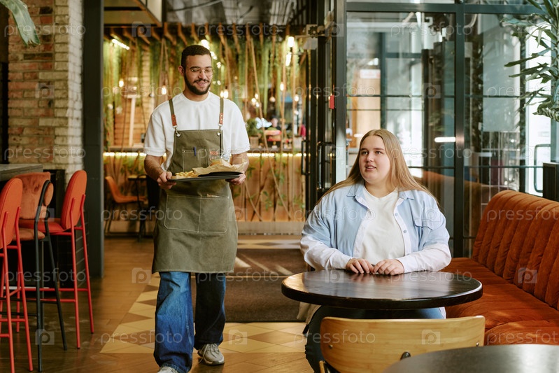 Женщина ждет, пока молодой человек подает еду в современном кафе