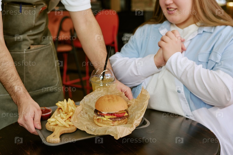 Молодая девушка ожидала съесть бургер и картошку в ресторане