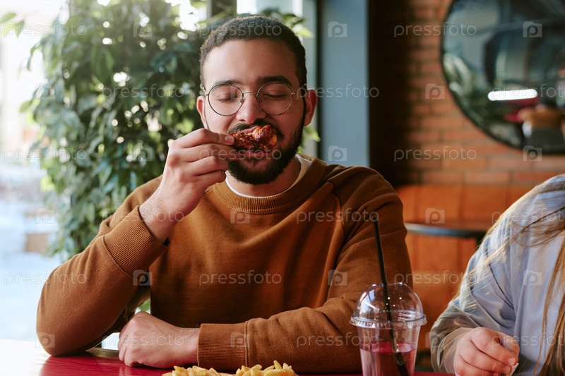 Молодой взрослый мужчина с Ближнего Востока наслаждается едой жареной курицы за столом в ресторане
