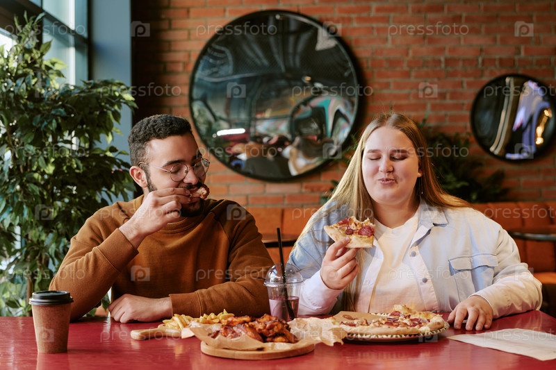 Молодая женщина и молодой мужчина наслаждаются едой пиццы вместе в помещении
