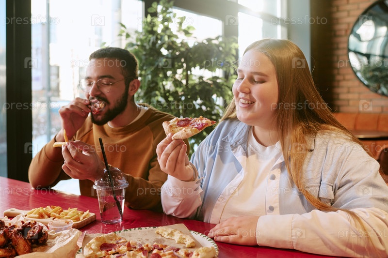 Молодая женщина и молодой мужчина с Ближнего Востока наслаждаются едой пиццы вместе