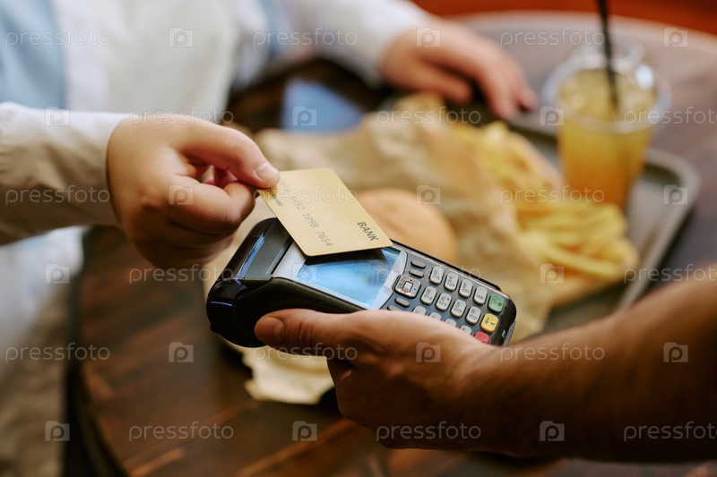 Молодая взрослая женщина платит кредитной картой на стойке ресторана