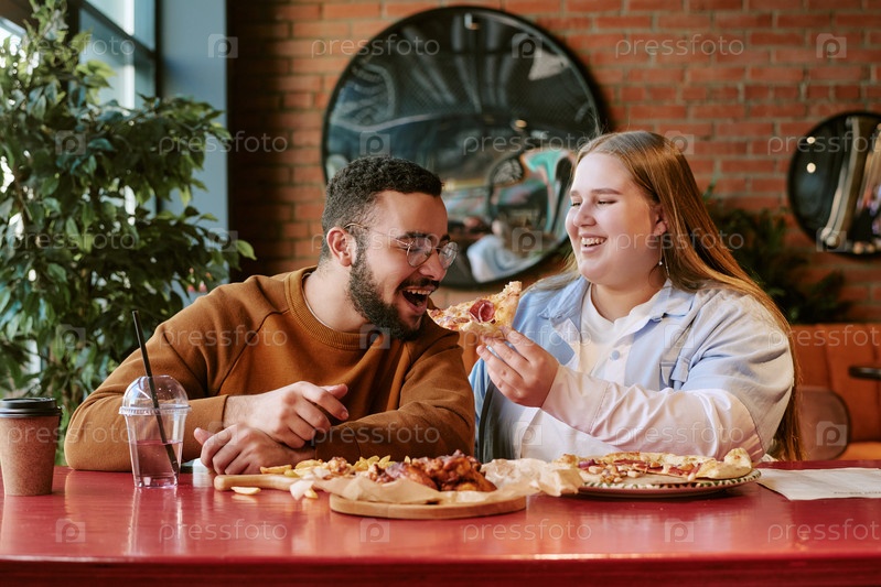 Молодая женщина кормит молодого мужчину с Ближнего Востока пиццей, улыбаясь в помещении