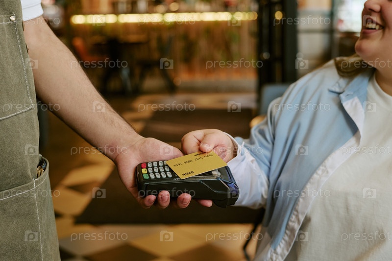 Молодая женщина улыбается, когда платит кредитной картой в ресторане
