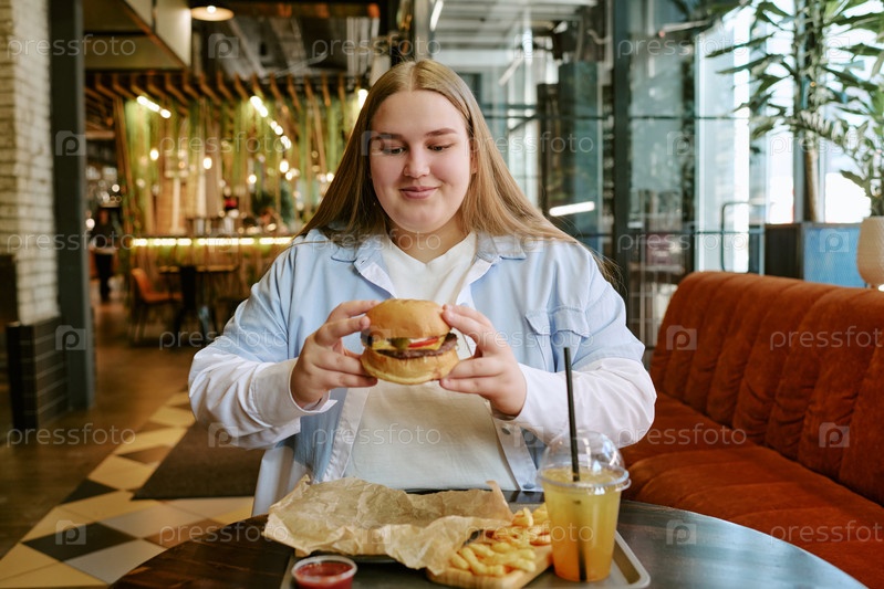 Молодая женщина улыбается, когда держит бургер и сидит в кафе