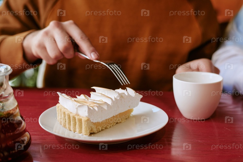 Молодой взрослый мужчина ест торт и пьет кофе за столом в кафе