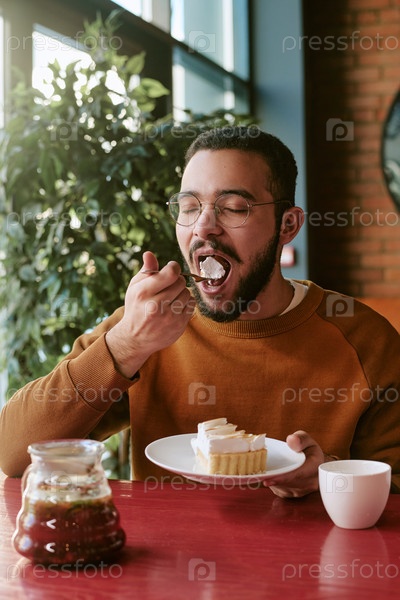 Молодой взрослый мужчина наслаждается едой десерта в кафе Table Indoors