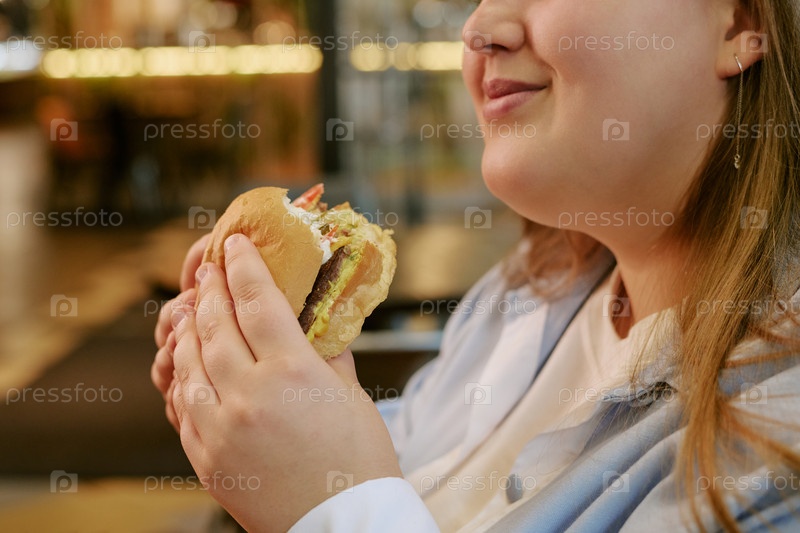 Молодая женщина наслаждается едой бургеров в ресторане