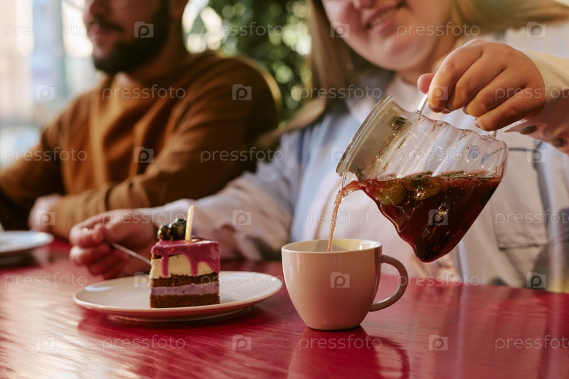 Молодая женщина наливает чай, сидя с молодым человеком в помещении