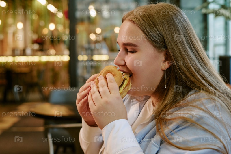Молодая женщина наслаждается едой бургера в современном ресторане Indoors