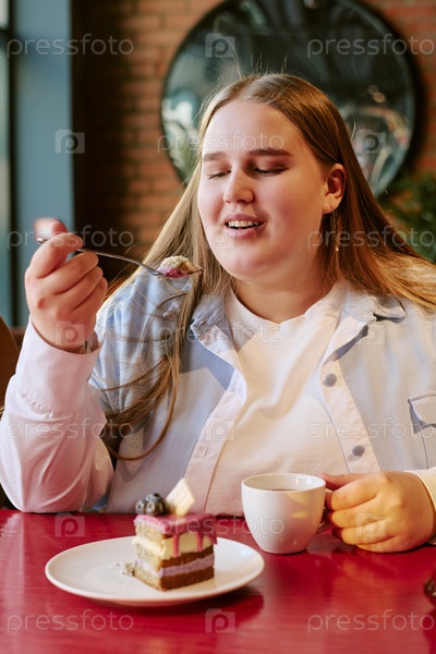Портрет молодой взрослой женщины, наслаждающейся десертом и пьющая кофе
