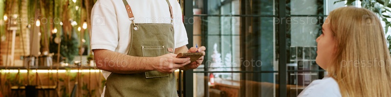 Молодая женщина заказывает еду у официанта в современном ресторане