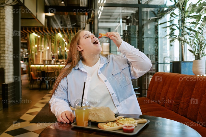 Молодая взрослая женщина наслаждается едой фаст-фуда в современном ресторане