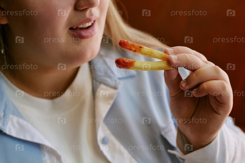 Молодая женщина держит картофель с кетчупом возле улыбающегося рта
