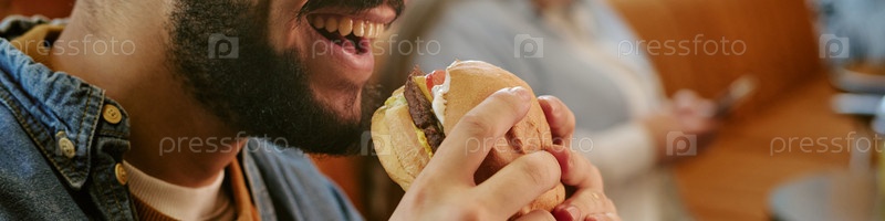 Молодой взрослый мужчина наслаждается едой гамбургера за столом в ресторане