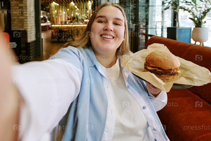 Портрет молодой взрослой женщины, улыбающейся во время хранения гамбургера в помещении