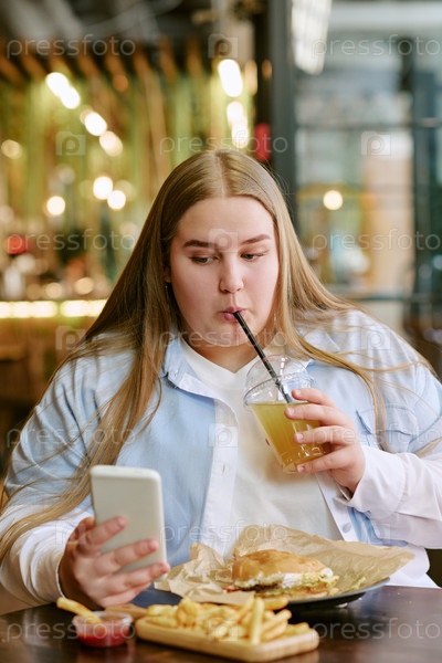 Портрет молодой взрослой женщины, пьющей сок при использовании смартфона