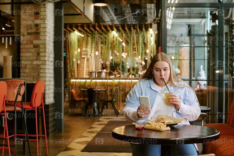 Молодая взрослая женщина, сидящая в кафе и использующая смартфон во время обеда