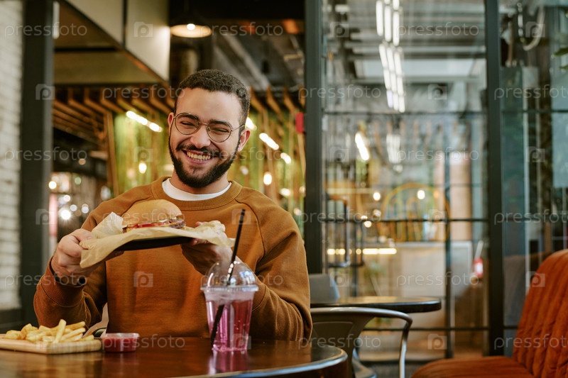 Молодой взрослый мужчина улыбается, когда ест бургер и картошку фри в помещении