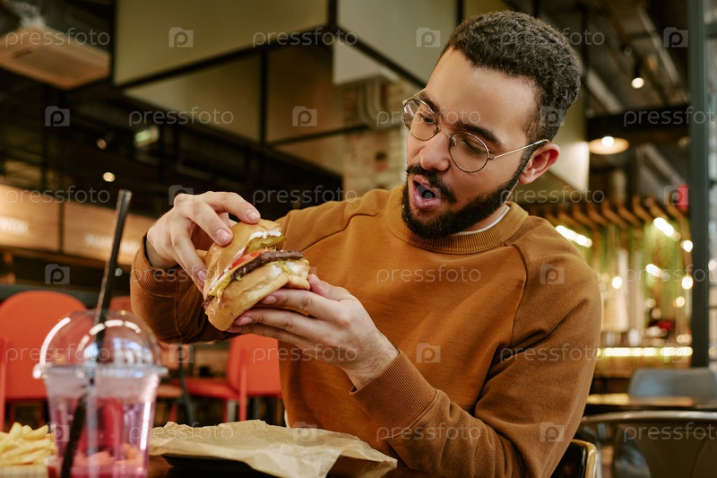 Молодой взрослый мужчина выражает удивление, осматривая большой бургер
