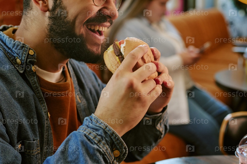 Молодой взрослый мужчина улыбается, когда ест бургер в кафе