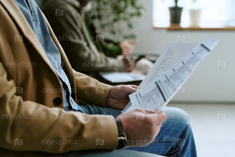 Кавказский мужчина ждет и читает документ в фойе филиала банка