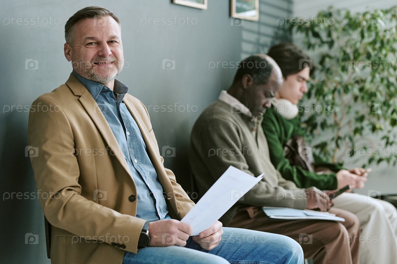 Портрет белого мужчины средних лет, улыбающегося во время ожидания в отделении банка