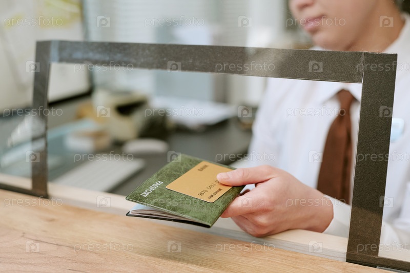 Молодая взрослая женщина вручает паспорт и кредитную карту на стойке отделения банка