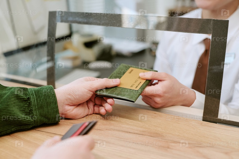 Получение банковской карты от кассира на счетчике в филиале рукой