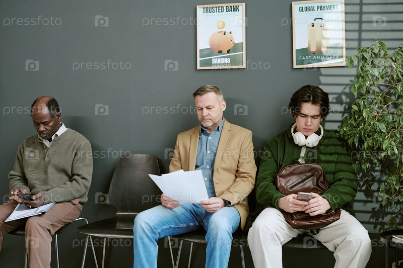 Мультиэтнические мужчины, ожидающие в лобби филиала банка с помощью смартфонов и чтения документов