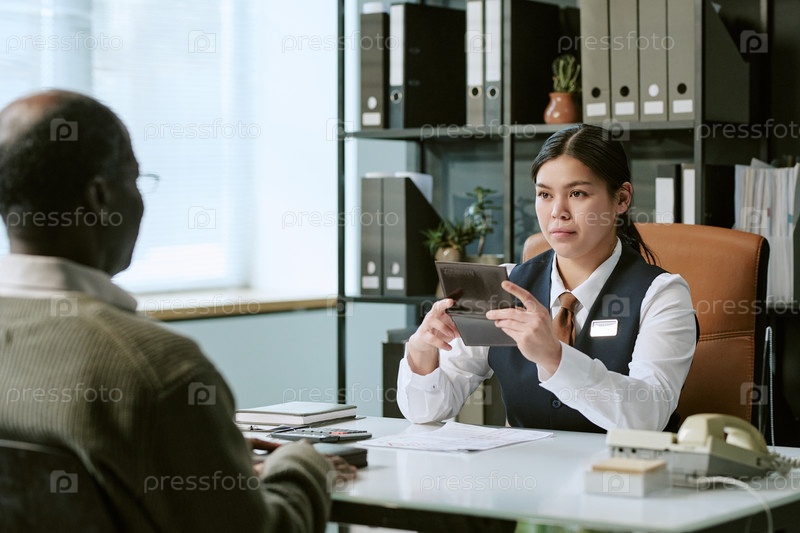 Молодая взрослая азиатская женщина помогает старшему американскому мужчине в отделении банка