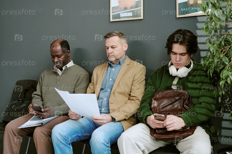 Кавказ среднего возраста и старший чернокожий мужчина ждут в лобби отделения банка