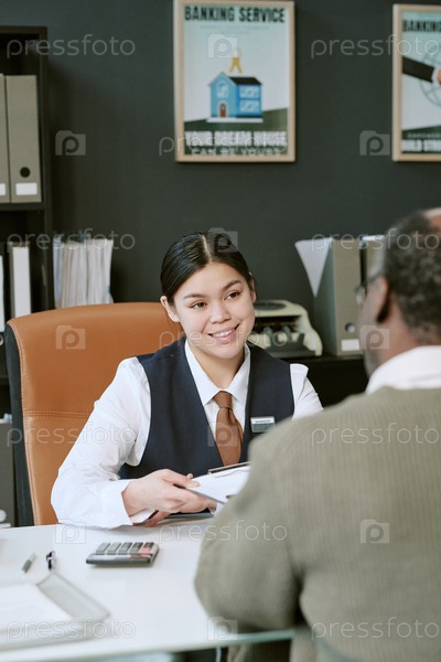 Молодая взрослая азиатская женщина помогает чернокожему мужчине среднего возраста в банковском отделении