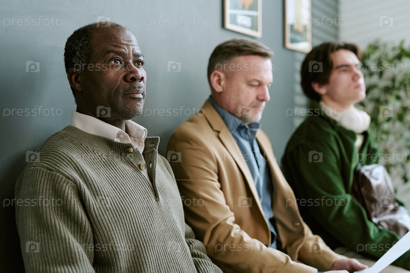 Чернокожий мужчина средних лет ждет с белыми мужчинами в зоне приема отделения банка