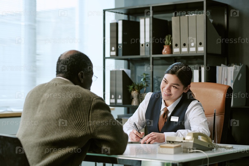 Азиатская женщина среднего возраста помогает старшему чернокожему мужчине во время банковской консультации