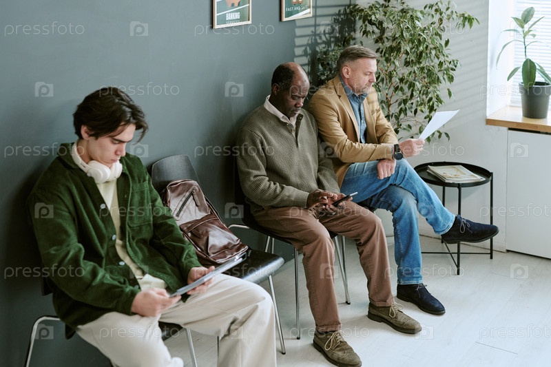 Мультиэтническая группа мужчин, ожидающих в банковском отделении приёмной зоны чтения документов