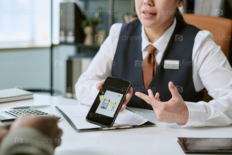 Женщина, объясняющая онлайн-банковское обслуживание клиенту в филиале