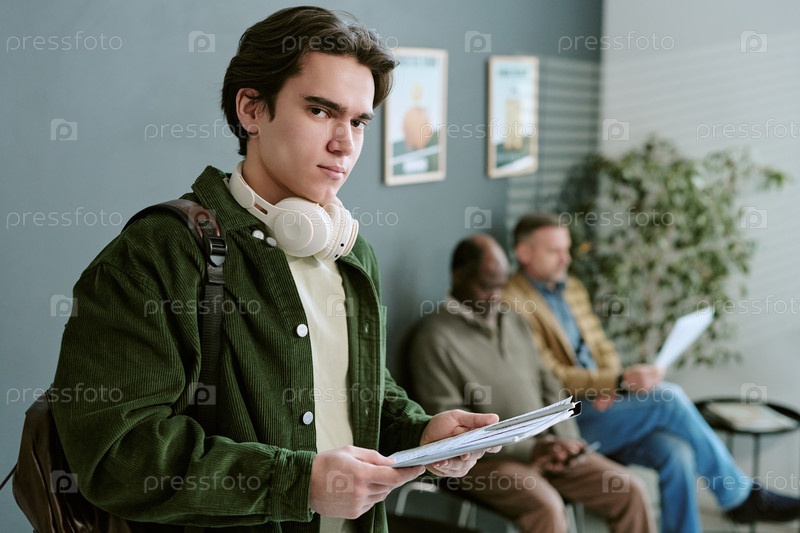 Портрет молодого белого мужчины, держащего документы и ожидающего в отделении банка